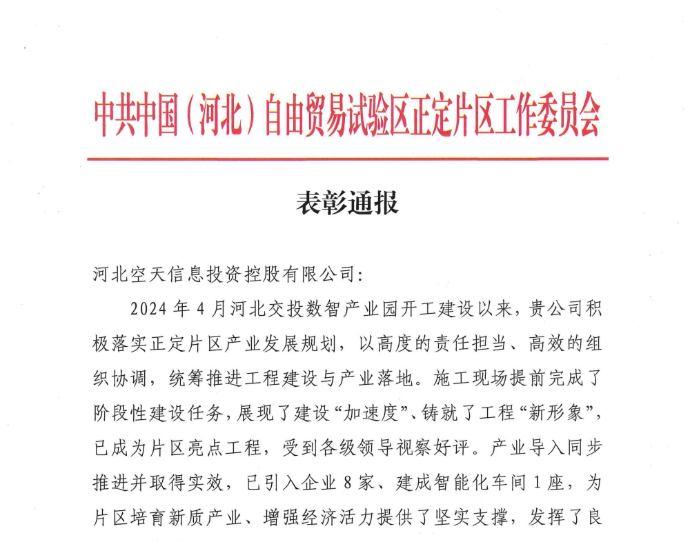 近期,中国(河北)自由贸易试验区正定片区党工委、管委会向河北空天控股公司发来表彰,对河北空天控股公司积极落实正定片区产业发展规划,统筹推进河北交投数智产业园建设与产业落地的努力予以通报表扬。2024年